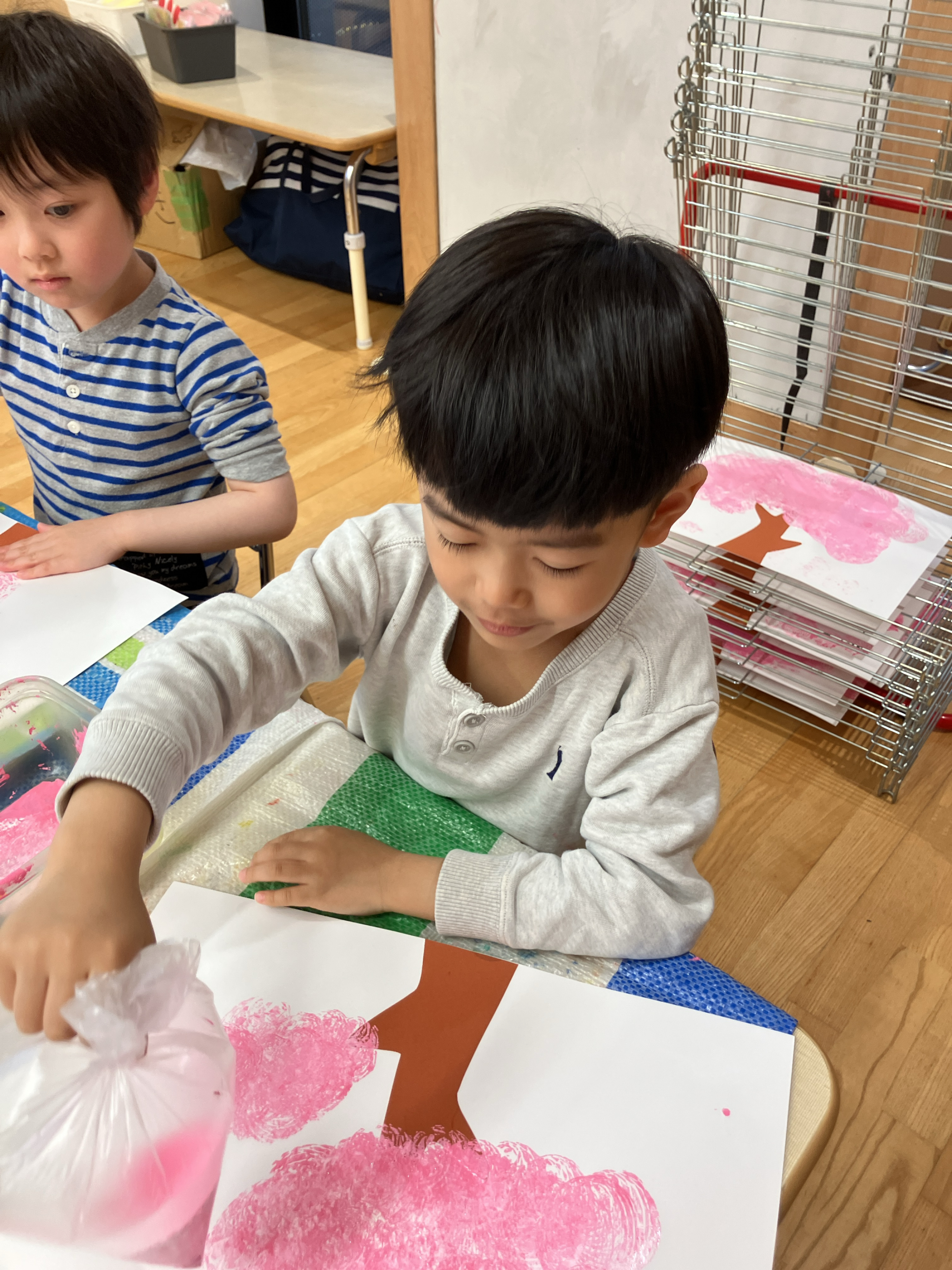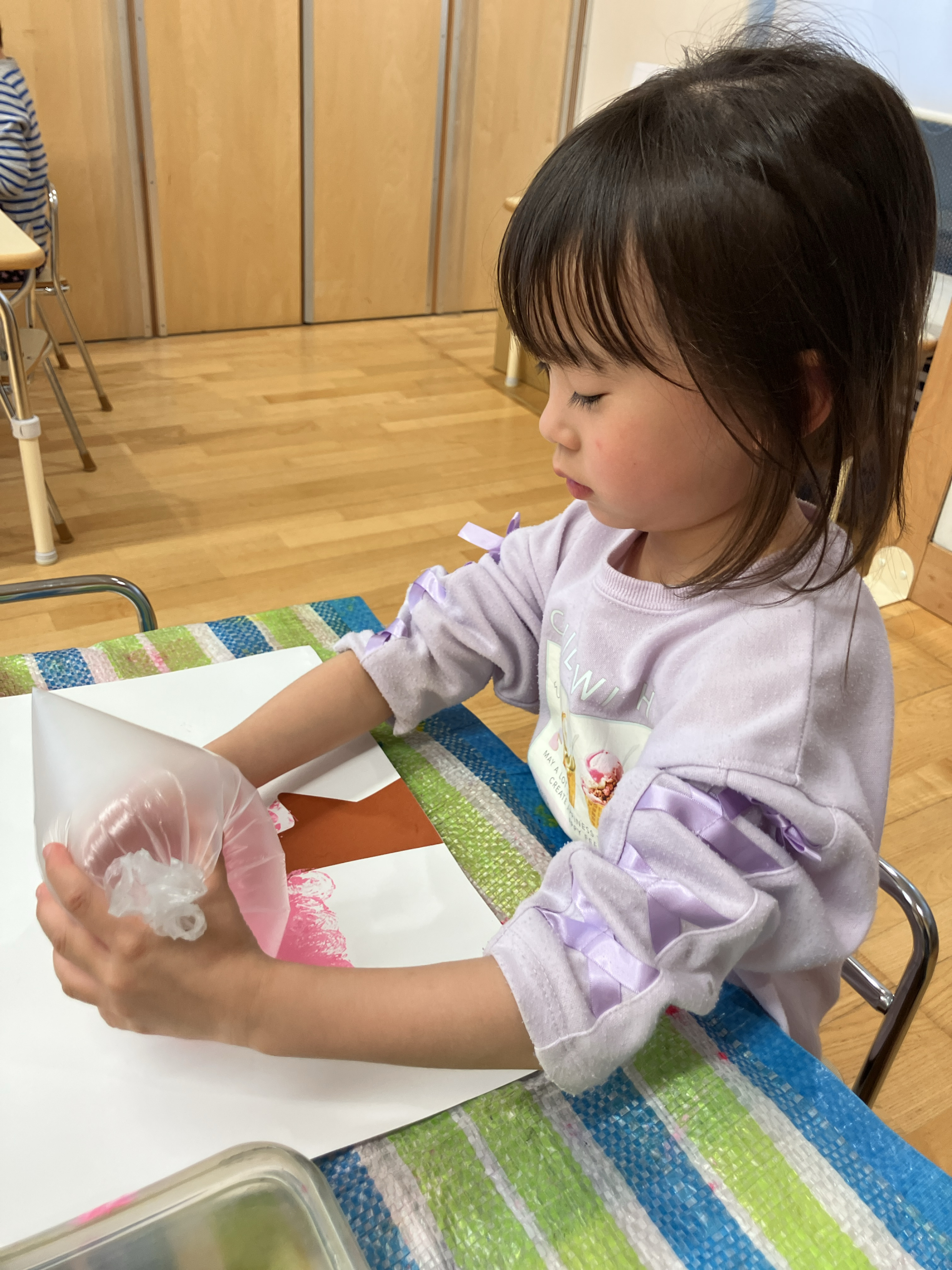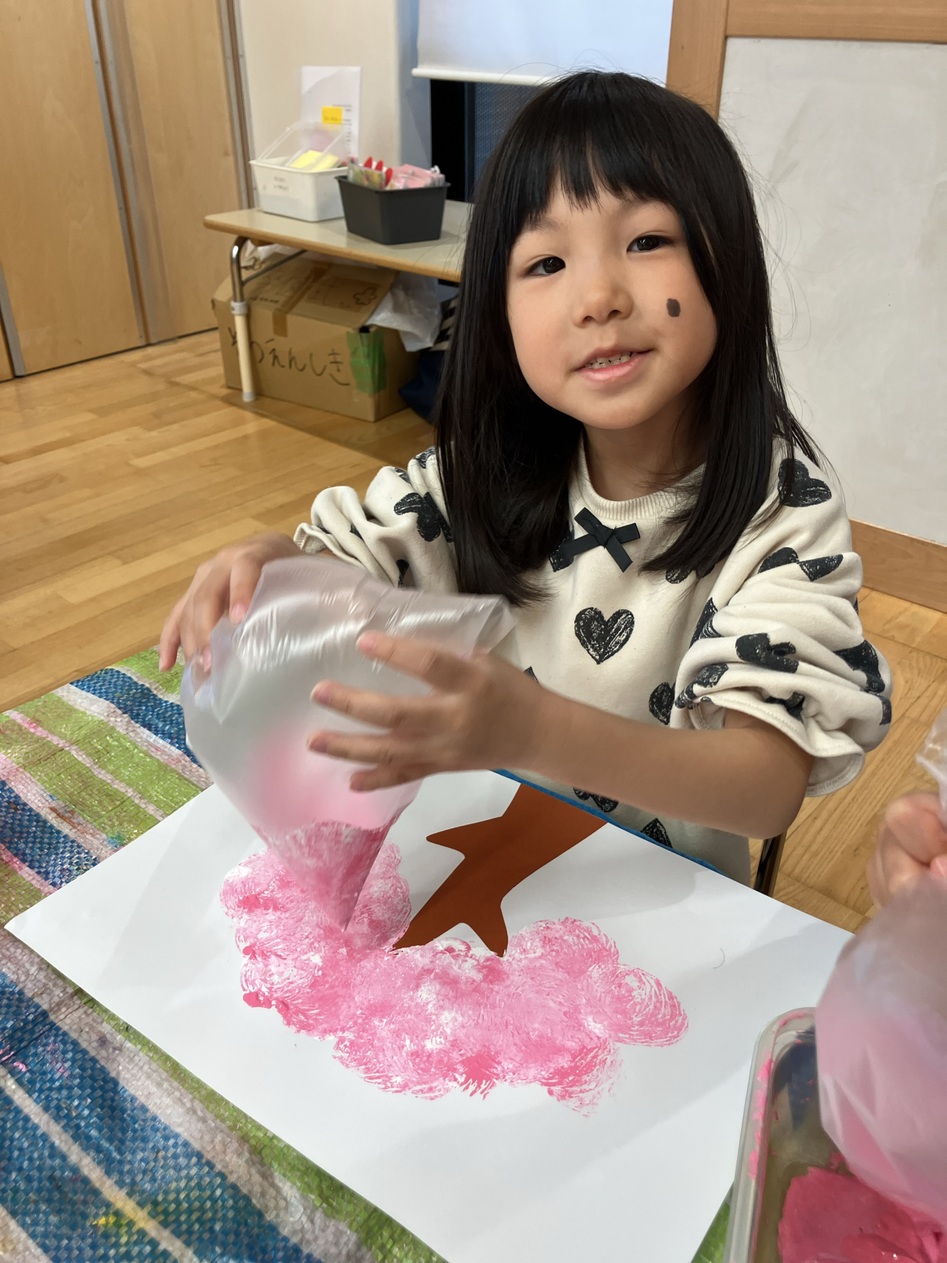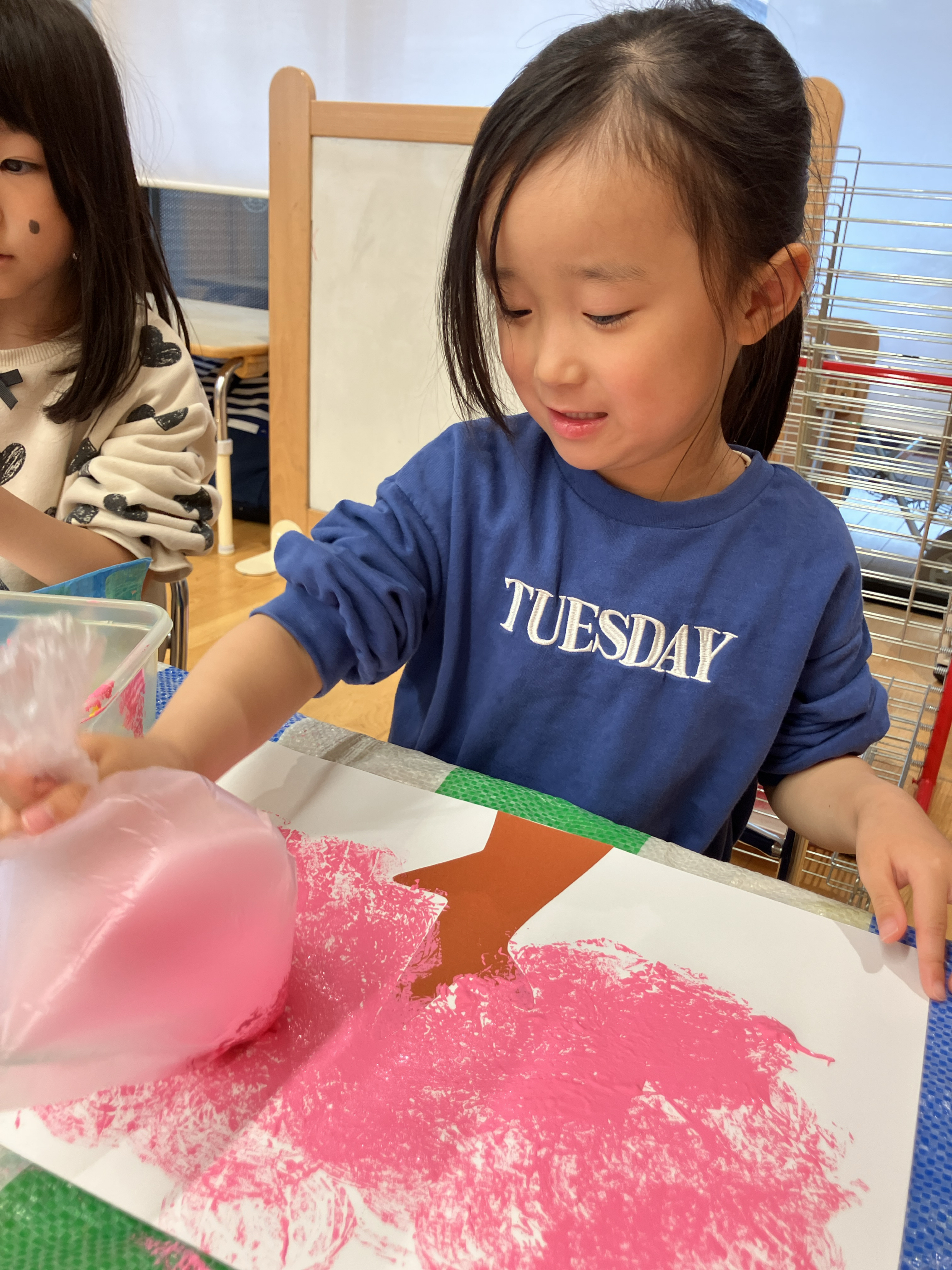 と、感触を楽しみながら、画用紙いっぱいにピンク色の花を咲かせてくれました。