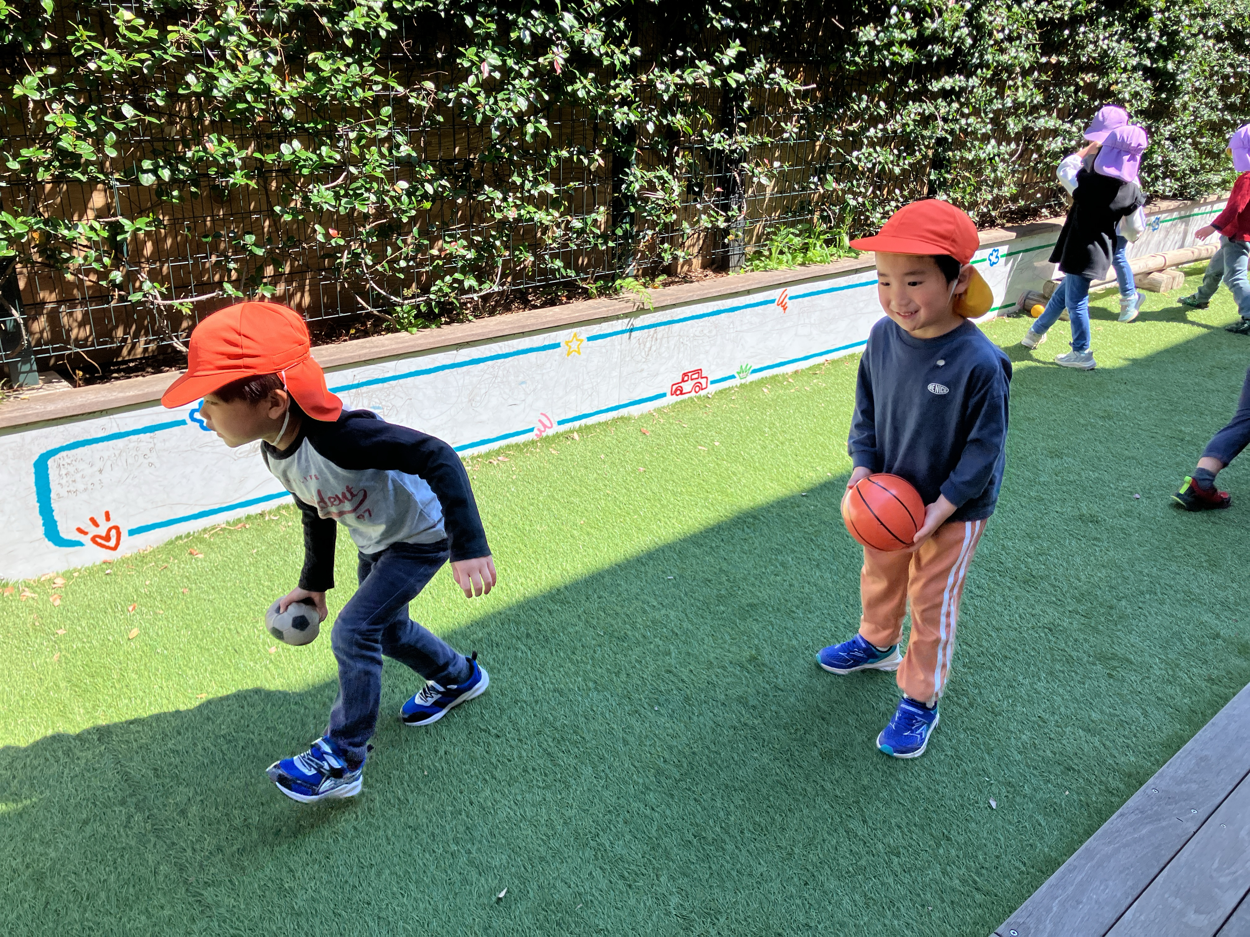 男の子たちはバスケットボールやサッカーに夢中。追いかける足取りもしっかりしてきて、成長を感じます。