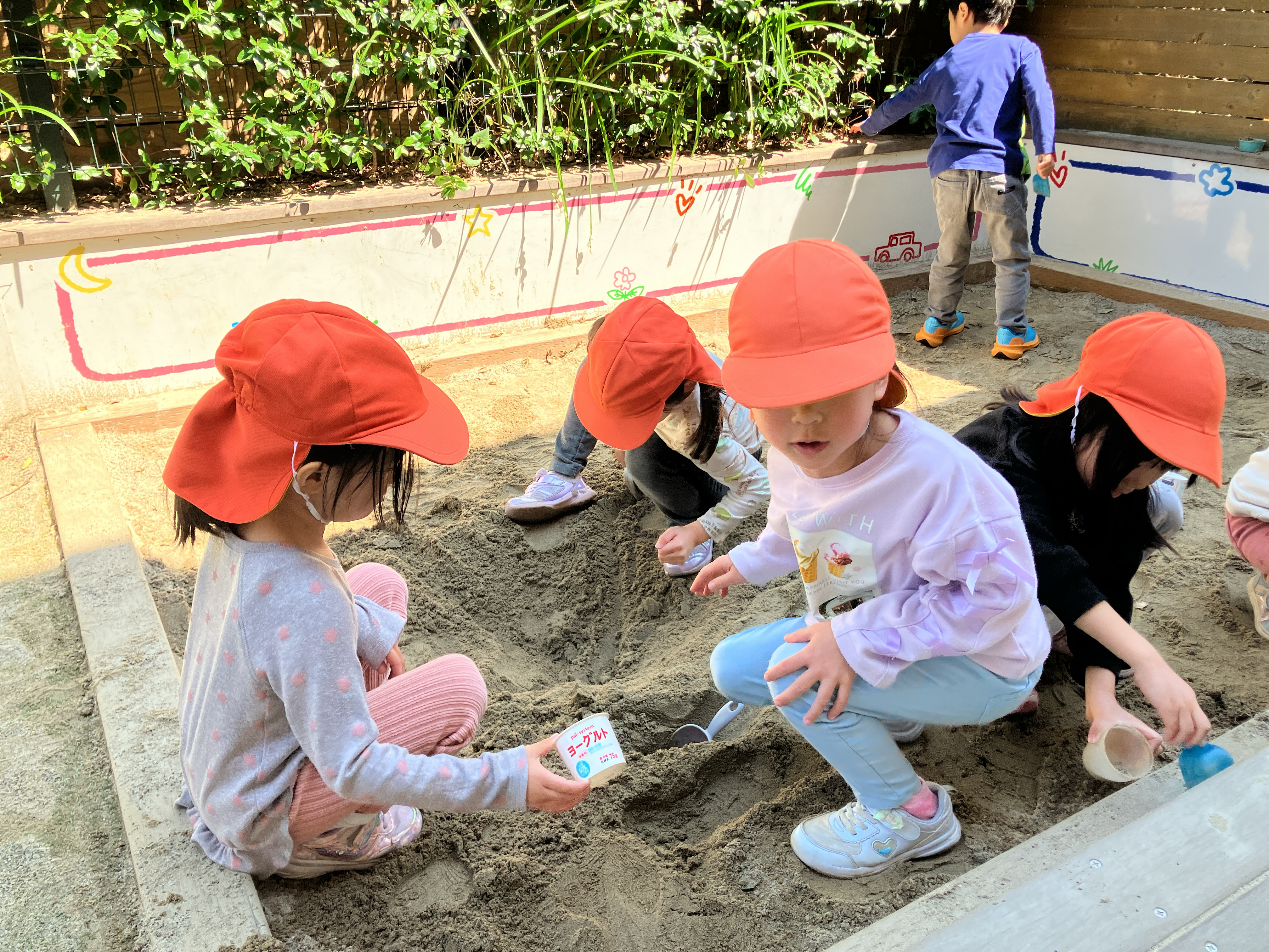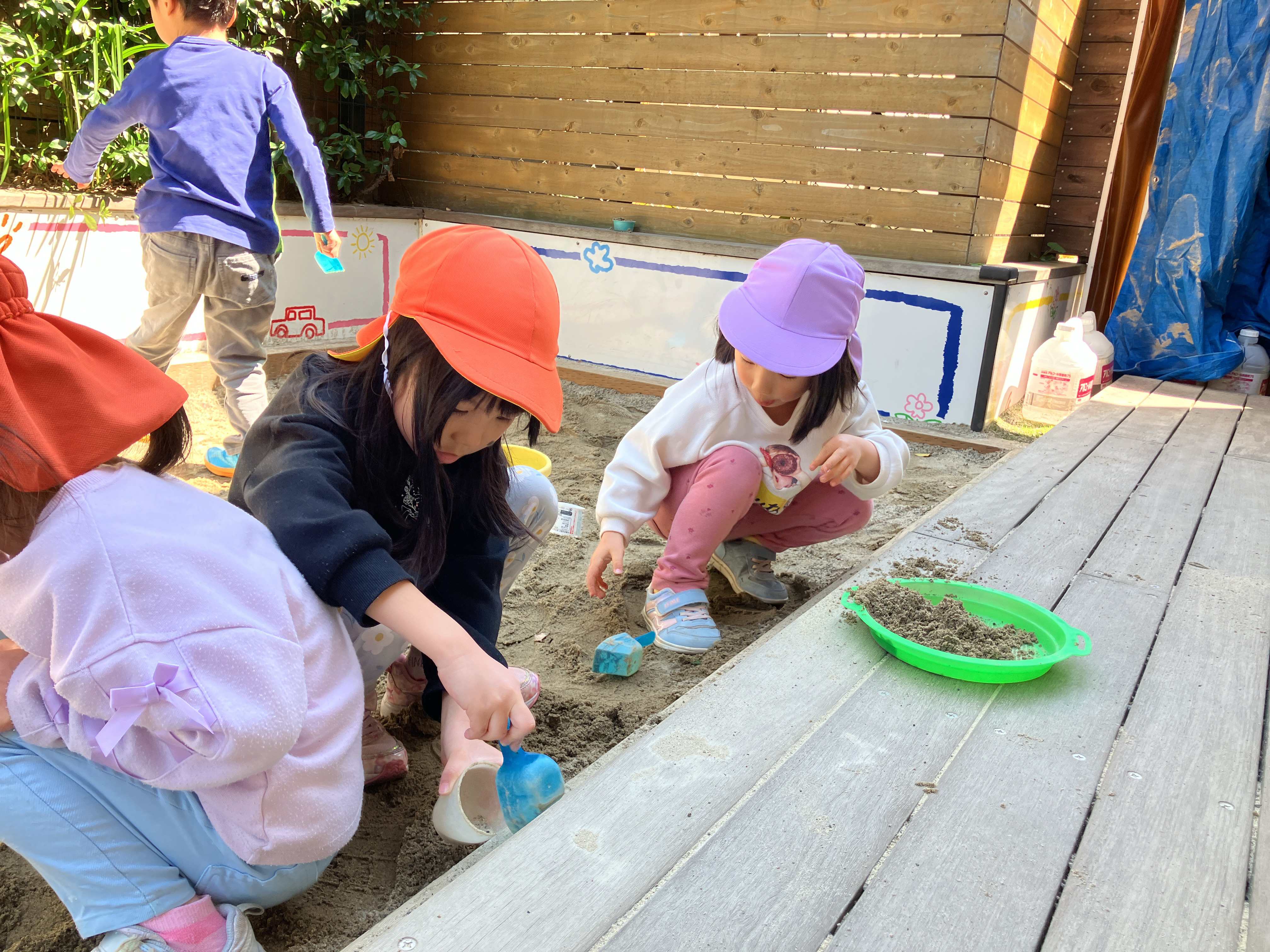 砂場では「工事現場」や「お料理屋さん」が開店!お友だちと協力して、大きなお山やごちそうを作っていました。