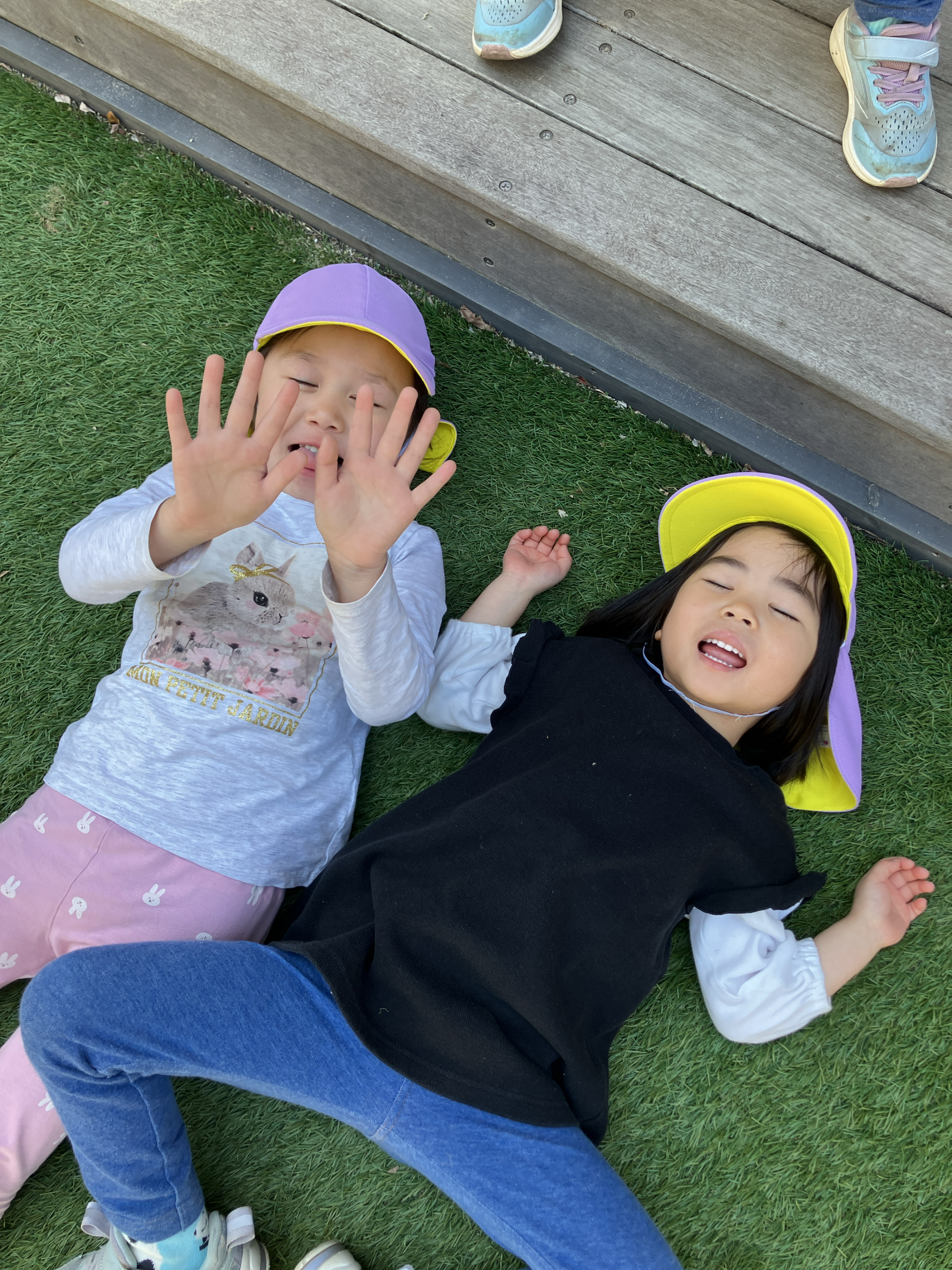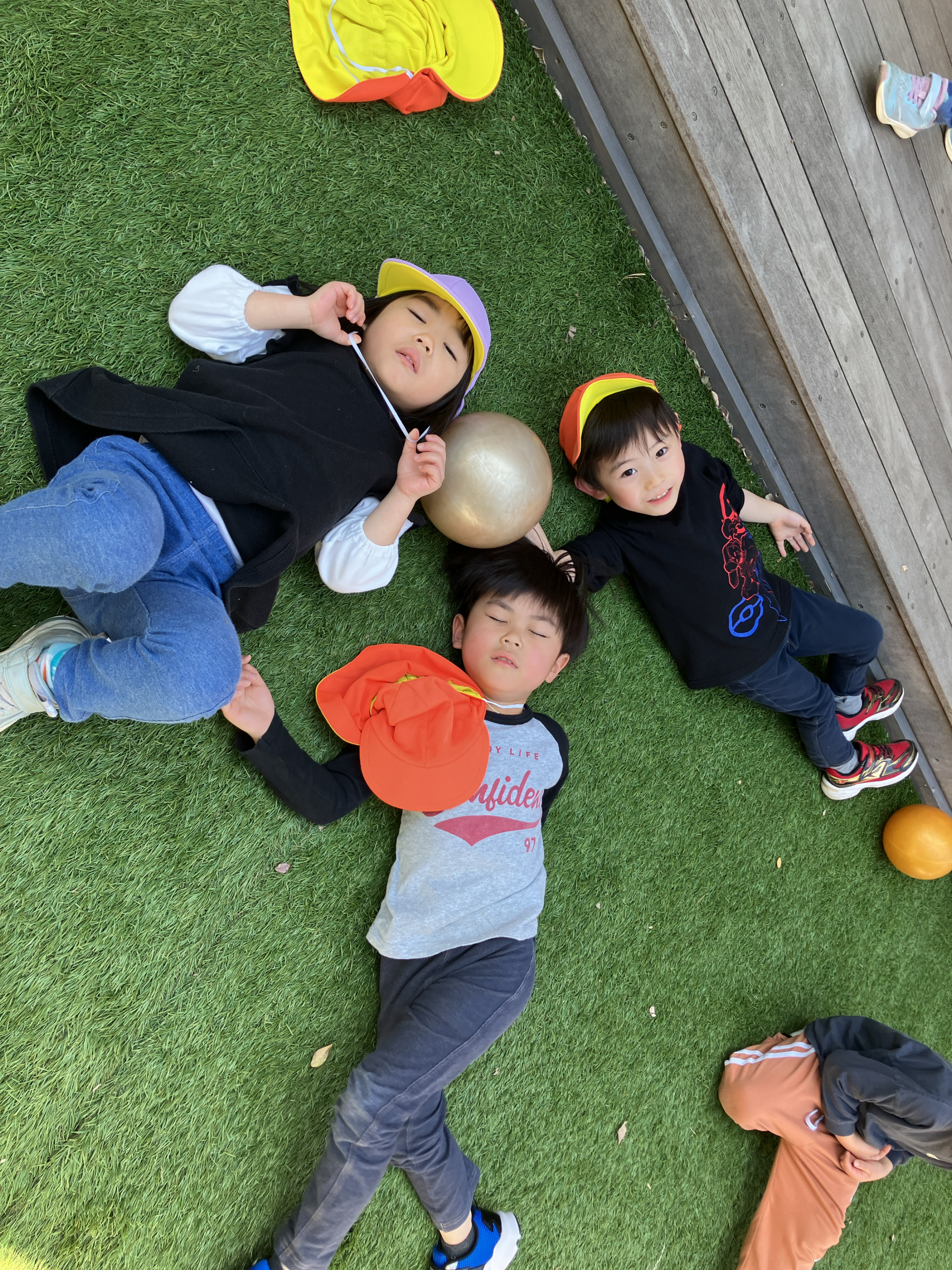 たくさん動いた後は、人工芝にゴロンと寝転がってひと休み。