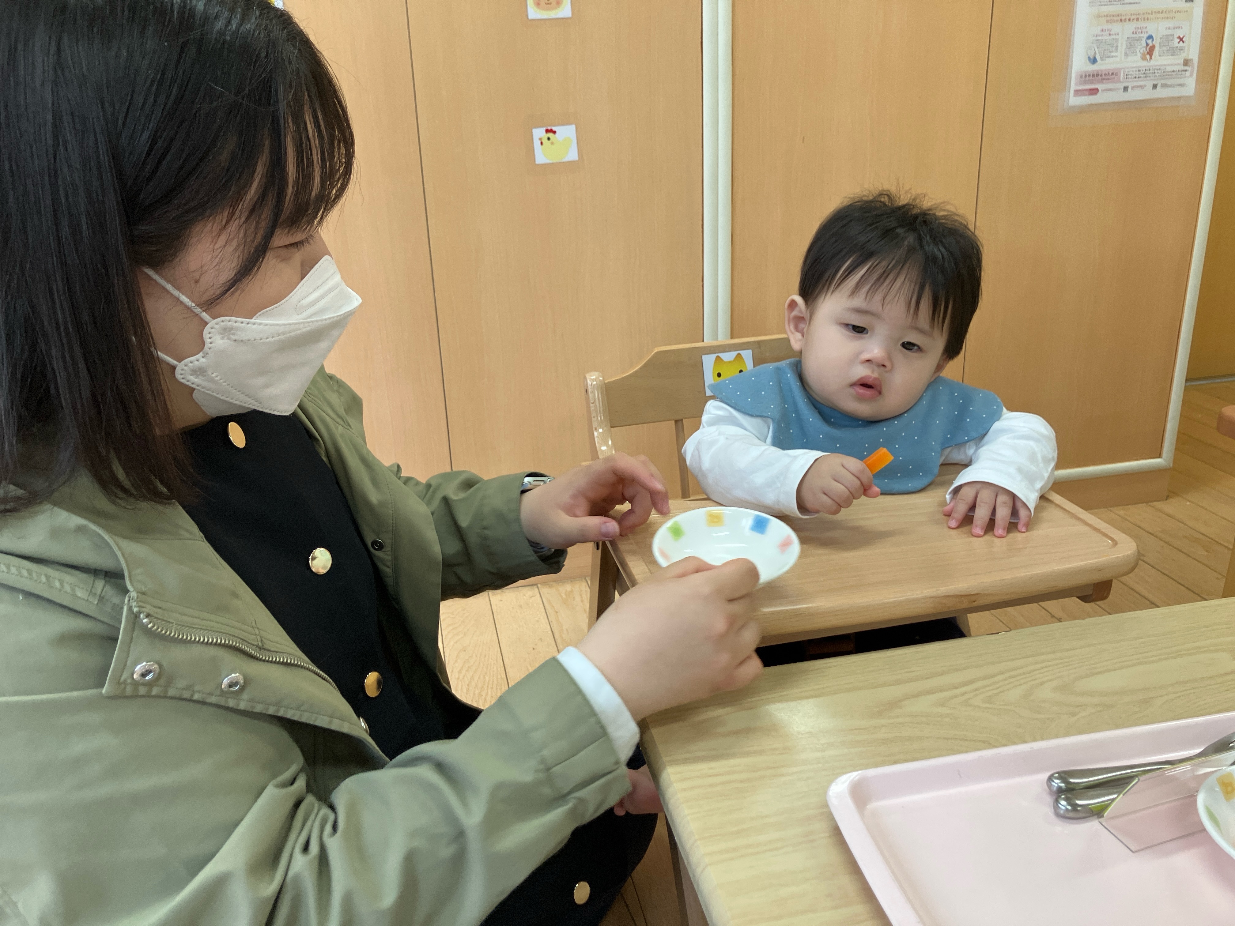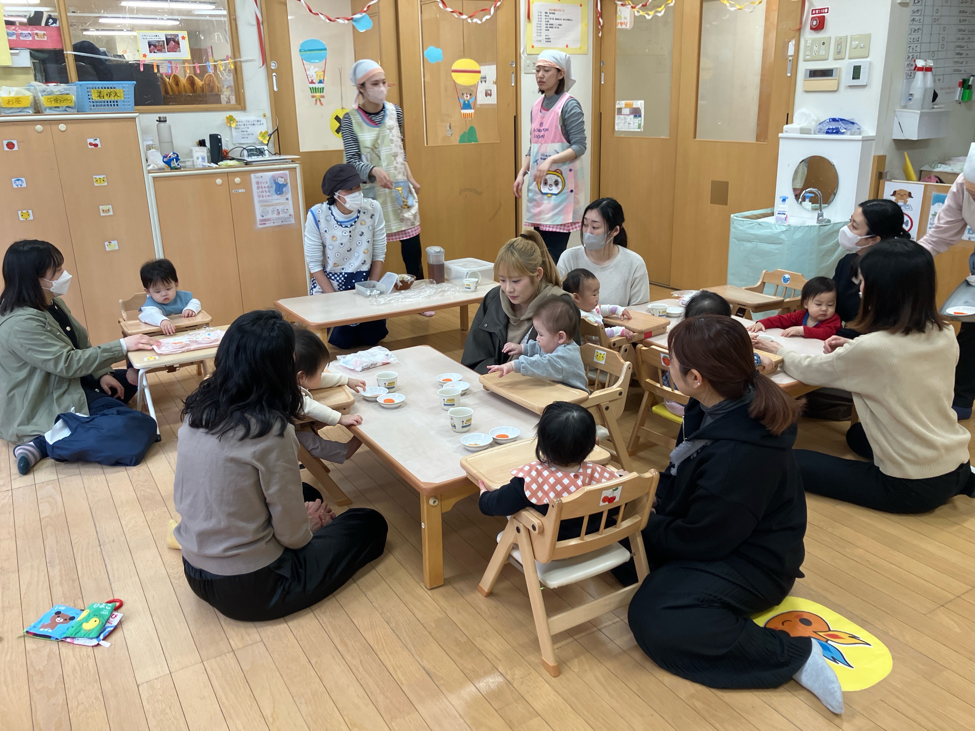 慣れ保育2日目は母子同室でゆったりと過ごし、離乳食の試食会を行いました。