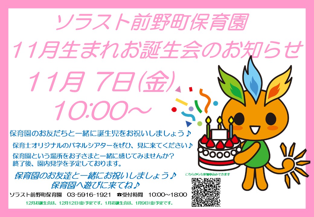 ソラスト前野町保育園から 11月お誕生会 のお知らせです!