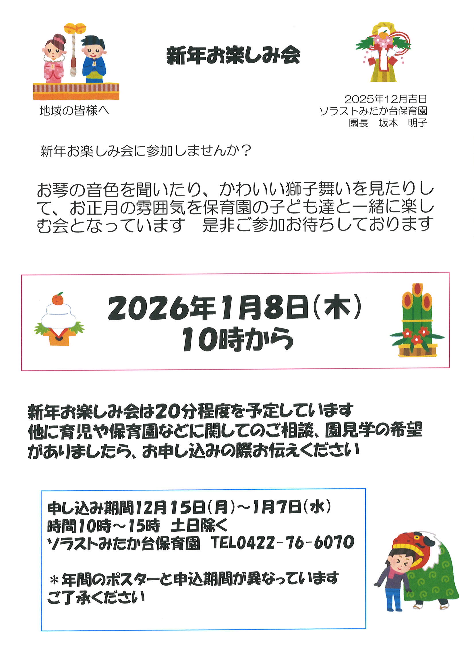 1月8日(木)新年お楽しみ会を行いますお琴の音色を聞き、お琴に触れる体験もできますかわいい手作りの獅子舞いも登場します是非ご参加ください♪★お問い合わせソラストみたか台保育園TEL0422-76-6070お気軽にお問い合わせください♪