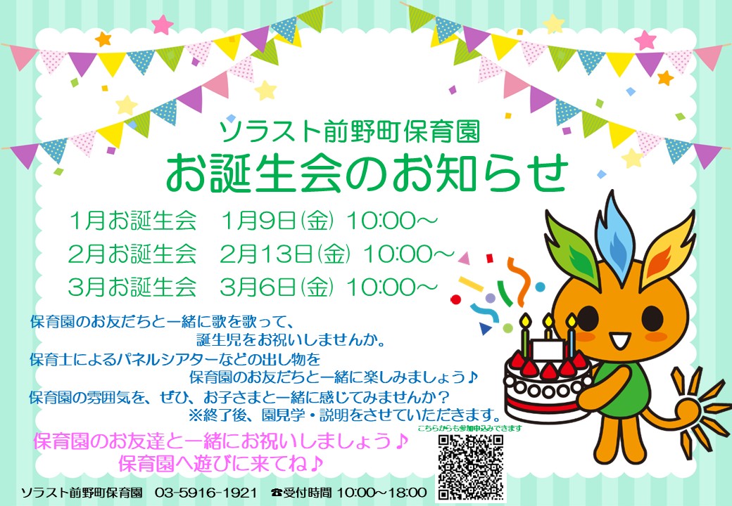 ソラスト前野町保育園から 1・2・3月お誕生会 のお知らせです!